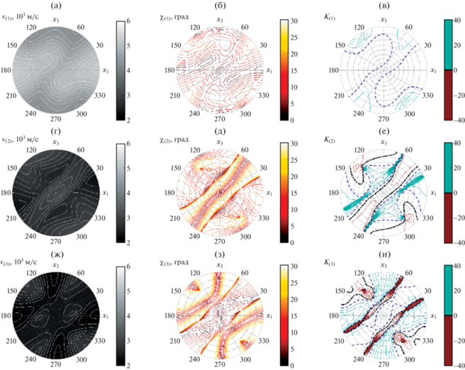 ${{g}_{i}} = \frac{1}{{{{\rho }}V}}\left[ {{{c}_{{ijkl}}}{{u}_{j}}{{u}_{k}}{{s}_{l}} + G\left( {{{e}_{{ijk}}}{{s}_{j}}{{u}_{k}} + {{e}_{{kij}}}{{s}_{k}}{{u}_{j}}} \right) - {{G}^{2}}{{{{\varepsilon }}}_{{ij}}}{{s}_{j}}} \right],$На рис. 1, 2 показаны свойства ОАВ в кристаллах йодноватой кислоты α-HIO3 и калий-иттриевого вольфрамата KY(WO4)2. На рисунках приведены стереографические проекции фазовой скорости V, угла сноса энергии χ и коэффициента дифракции K. В орторомбическом кристалле плоскости x1x2, x1x3 и x2x3 являются плоскостями симметрии акустических свойств; в моноклинном кристалле осью симметрии второго порядка является ось x2, а плоскостью симметрии – x1x3. В направлении акустических осей конического типа K → ∞, следовательно, наблюдается максимальное сгущение изолиний на графиках коэффициентов дифракции. Отметим, что в кристалле KY(WO4)2 существует область направлений, в которой одновременно W1 < 0 и W2 < 0 для медленной квазисдвиговой ОАВ [34].
