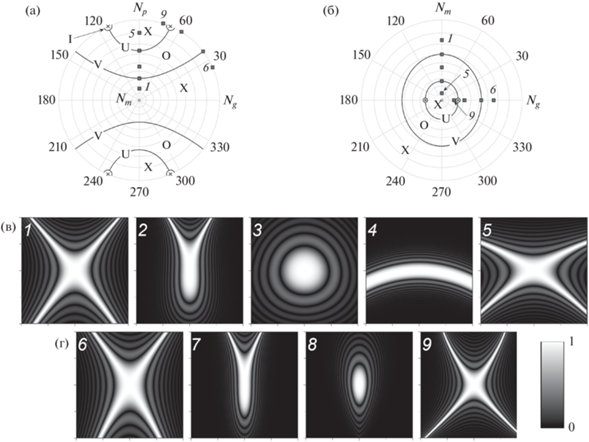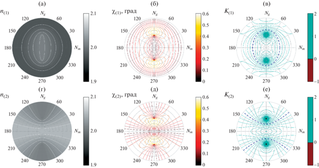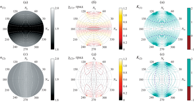Оптические свойства орторомбического кристалла α-HIO3 в стереографической проекции на плоскость NgNp: а, г – показатель преломления, изолинии построены через 0.1; б, д – угол сноса энергии, изолинии построены через 0.1; в, е – коэффициент дифракции упругой волны, изолинии построены через 0.1, штриховые линии – изолинии уровня K = 1. Оптические моды: а–в – быстрая, г–е – медленная.