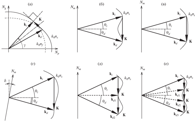 Для вычисления основных характеристик АО-взаимодействия находят показатели преломления n и векторы поляризации d взаимодействующих волн методом эллипсоида показателей преломления [39]. В данном методе используется поперечная компонента тензора диэлектрической непроницаемости ${{\hat {\eta }}} = {{{{\hat {\varepsilon }}}}^{{ - 1}}}$. Собственные векторы поперечного тензора непроницаемости, d(1) и d(2), сортируются по убыванию фазовых скоростей: n(1) ≤ n(2). Зависимости n(1)(s) и n(2)(s) описывают двуполостную поверхность показателей преломления с коническими точками вырождения при n(1) = n(2) – оптическими осями. При учете поглощения кристалла происходит расщепление оптических осей кристалла [40], что может менять конфигурацию приосевых геометрий АО-взаимодействия. Существенные изменения таких геометрий также будут иметь место в оптически активных кристаллах. Возможность применения таких геометрий АО-взаимодействия для управления бесселевыми векторными пучками рассмотрена в [41].