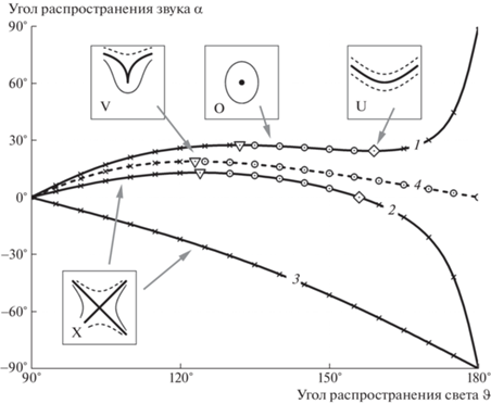 Направления вблизи конических осей интересны тем, что в их окрестности поле поляризаций сингулярно, причем локальные топологические свойства волновых поверхностей и поля поляризаций имеют универсальное описание для акустических и оптических волн [35, 36]. Одним из свойств этой сингулярности является сильная зависимость АО-свойств кристаллов от направления, поскольку поляризации как акустических, так и оптических мод определяют эффективность АО-дифракции, как будет показано в разд. 2.2.