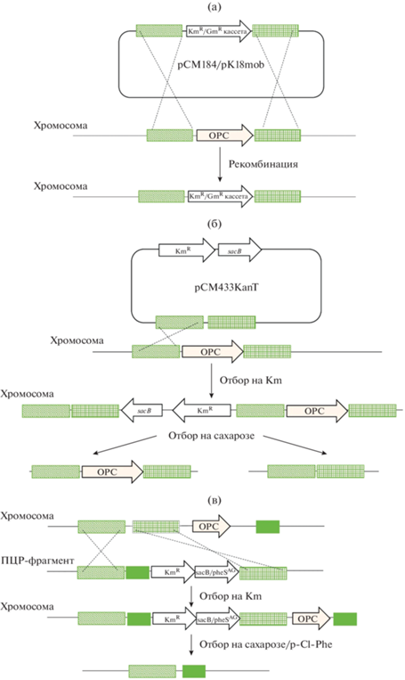 Способы генетического редактирования метанотрофов (схемы внесения модификаций в хромосому метанотрофов): а ‒ двойная гомологичная рекомбинация с использованием суицидальной плазмиды; б ‒ использование плазмиды с геном контрселекции sacB для получения безмаркерных мутаций; в ‒ использование ПЦР-фрагментов с генами контрселекции sacB или pheSAG для получения безмаркерных мутаций.