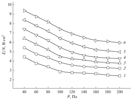 Зависимость приведенной напряженности электрического поля от давления газа дифтордихлорметана (1 – i = 10 мА, 2 – 15 мА, 3 – 20 мА, 4 – 25 мА, 5 – 30 мА, 6 – 35 мА).