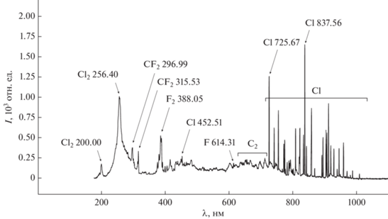 Эксперименты показали, что излучение плазмы дифтордихлорметана представлено как атомарными, так и молекулярными компонентами (рис. 4). В спектрах излучения были обнаружены две группы линий атомарного хлора (менее интенсивные в сине-зеленой части спектра 430–460 нм, (наиболее интенсивная 452 нм), обусловленные возбуждением состояния 5p, εth = 11.8–11.9 эВ, и более интенсивные в красной области 700–950 нм, связанные с излучательной дезактивацией состояния 4p, εth ∼ 10.4 эВ) [11, 13]. Излучение атомарного фтора представлено группой слабоинтенсивных линий в диапазоне 610–710 нм (наиболее интенсивная 614 нм). Излучение атомарного углерода зафиксировано не было. Излучение молекулярных компонентов представлено полосами CF (206, 209 нм), CF2 (263, 266, 267, 271, 296, 315 нм), F2 (388 нм), CCl (277 и 278 нм), Cl2 (256 и 200 нм) и С2 системы Свана (465–570 нм).