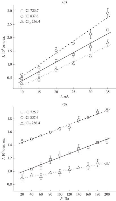 На графике зависимости интенсивности излучения от тока разряда (рис. 5а) с ростом тока наблюдается линейное увеличение интенсивности излучения всех рассматриваемых линий и полос, что соответствует механизму прямого возбуждения излучающих состояний при электронном ударе и свидетельствует об отсутствии вторичных процессов. Изменение давления газа в интервале 40–200 Па вызывает линейное увеличение интенсивности излучения всех линий и полос (рис. 5б), однако интенсивность линии Cl 837.56 и 725.67 нм возрастают значительно быстрее, чем интенсивность полосы Cl2 256.4.