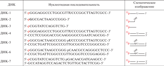 С полученными 32Р-мечеными олигонуклеотидами создавали ДНК-дуплексы, структура и обозначение которых приведены в табл. 1. Олигонуклеотиды смешивали в эквимолярном соотношении и проводили гибридизацию, нагревая в течение 5 мин при 95°С с последующим медленным охлаждением до комнатной температуры.