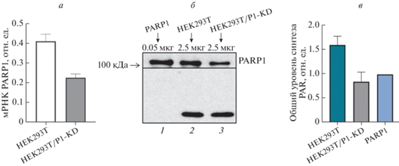 Результаты ОТ-кПЦР (а), вестерн-блот-анализа уровня PARP1 в клеточных линиях HEK293T и H-EK293T/P1-KD (б) и синтеза поли(ADP-рибозы) в цельноклеточных экстрактах (в). Относительные уровни мРНК определены в трех независимых экспериментах и представлены в виде средних значений со стандартным отклонением. Количество поли(ADP-рибозы), синтезированной за 1 мин при 37°C, представлено в виде гистограммы. В каждом эксперименте количество PAR, синтезируемой эндогенными PARP экстрактов, нормировали на количество полимера, синтезированное с помощью 30 нМ рекомбинантного PARP1. Данные представлены как среднее значение ± стандартное отклонение, вычисленные из трех независимых экспериментов.