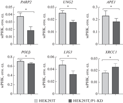 Сравнение относительного уровня мРНК PARP2, UNG, APE1, POLβ, LIG3 и XRCC1 в клетках HEK293T и HEK293T/P1-KD