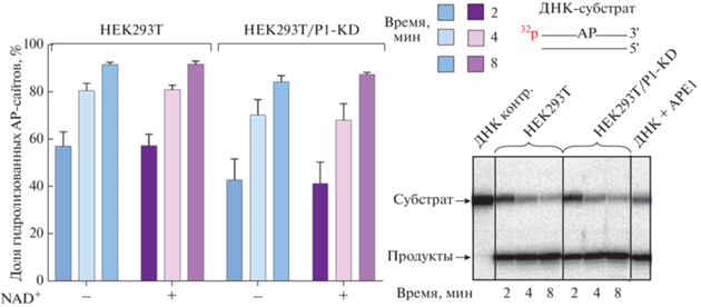 Данные о взаимном влиянии PARP1 и APE1 в процессе BER противоречивы. Следует отметить, что наблюдали как стимулирующие, так и ингибирующие эффекты при кооперации этих ферментов [12, 13, 39–41]. На рис. 4 представлены данные по эффективности расщепления АР-сайтов. Степень гидролиза АР-сайтов в экстракте клеток НЕК293Т/P1-KD несколько ниже, чем в экстракте клеток родительской линии. Таким образом, в использованных условиях PARP1 оказывает слабое стимулирующее влияние. Присутствие NAD+ как субстрата PARилирования практически не влияет на процесс.