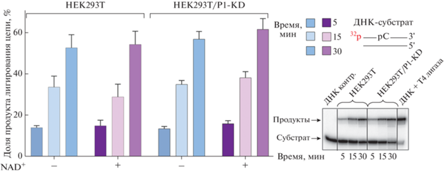 Эффективность лигирования ДНК. Реакционные смеси (10 мкл) содержали 0.1 мкМ 32P-меченый ДНК-дуплекс, 0.05 мг/мл белков экстракта или 0.1 ед.акт./мкл ДНК-лигазы T4, 5 мМ MgCl2, 1 мМ АТР, 400 мкМ NAD+ (где указано) и буферные компоненты. Данные представлены как среднее значение ± стандартное отклонение, вычисленные из трех независимых экспериментов.
