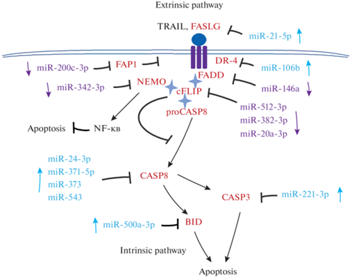 Схема компонентов внешнего пути апоптоза и миРНК, участвующих в его регуляции при