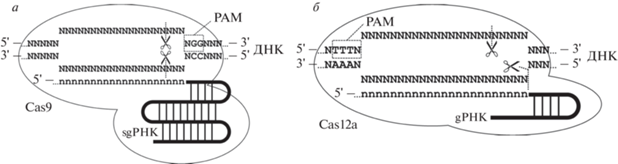 Белок Cas9 (в дальнейшем, если нет дополнительных уточнений, рассматривается Cas9 из Streptococcus pyogenes, SpCas9) состоит из нескольких доменов и обладает РНК-зависимой ДНК-эндонуклеазной активностью, локализованной в двух из них: HNH-домене (домен, содержащий высококонсервативные остатки His–Asn–His), который расщепляет цепь ДНК, комплементарную направляющей РНК (адресуемая цепь), и RuvC-подобном домене, гидролизующем цепь ДНК, совпадающую с последовательностью направляющей РНК (неадресуемая цепь) [4, 5]. Для расщепления ДНК необходимо наличие в ней протоспейсера ‒ участка двухцепочечной ДНК (дцДНК), одна из цепей которой образует комплементарные связи с направляющей РНК, и примыкающего непосредственно к протоспейсеру мотива 5′-NGG-3′ (PAM, англ. Protospacer-Adjacent Motif) (рис. 1а).