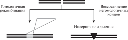 Пути репарации двухцепочечного разрыва в клетках с образованием точной замены (гомологичная рекомбинация) или инсерции/делеции (воссоединение негомологичных концов). Донор генетического материала для гомологичной рекомбинации обозначен серым цветом.
