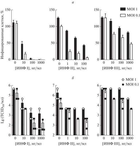 Влияние интерферонов I, II и III типов на инфицированные SARS-CoV-2 клетки Vero E6. а ‒ Процент инфицированных клеток Vero E6, рассчитанный как соотношение клеток, позитивных на вирусный белок нуклеопротеин (NP), к общему числу клеток (данные представлены как среднее значение ± стандартное отклонение, n = 3). б ‒ Анализ титров вируса, выраженных как TCID50,в супернатантах клеток Vero E6 (данные представлены как среднее ± SEM, n = 3) [17, Creative Commons Attribution License 4.0 (CC BY)].