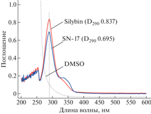 На рис. 2 приведены спектры поглощения растворов силибина и образца SN-17 в ДМСО, подтверждающие присутствие силибина в составе полимерной композиции.