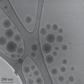 Сферическая форма частиц и их размеры в диапазоне 200–300 нм были подтверждены с помощью крио-ПЭМ. На рис. 4 представлено изображение частиц образца SN-17.