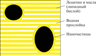 Можно предложить следующий возможный механизм влияния наночастиц оксидов металлов на вязкость ЛЖК лецитина (рис. 10). Толщина липидного бислоя в ЛЖК в системе лецитин–вода составляет ~3.5 нм, толщина полярной части между бислоями (вода и полярные “головы” молекул лецитина) в зависимости от содержания воды варьируется в диапазоне 1.5 до 3.5 нм [32]. Можно предположить, что для ЛЖК в системе лецитин–смесь масел–вода толщина липидной части увеличится еще на 1.0–1.5 нм, поскольку объем масла в составе изученных образцов примерно в 2 раза меньше, чем объем воды. В целом получается, что период укладки бислоев не превышает 10 нм, а диаметр введенных наночастиц в несколько раз больше, чем это расстояние. Лецитин – это ПАВ, его молекулы будут адсорбироваться на поверхности наночастиц. Значит, наночастицы, окруженные адсорбированными на них молекулами лецитина, будут находиться между несколькими бислоями, играя роль “мостиков”, укрепляющих пространственную структуру при воздействии сдвиговых нагрузок, возникающих вдоль бислоев при течении образца при низких скоростях сдвига. Поэтому, даже находясь в концентрациях в десятые и сотые доли массовых процентов, т.е. занимая тысячные и десятитысячные доли от объема образца, наночастицы оксидов металлов с размером в десятки нанометров могут существенно увеличивать вязкость ЛЖК кристаллов при низких скоростях сдвига.