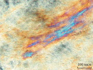 Наночастицы вводили в виде водной дисперсии в ходе получения ЖК. Состав ЖК-матрицы, мас. %: лецитин – 57.7, масло авокадо – 8.2, масло чайного дерева – 4.1, водная дисперсия частиц CuO – 30.0. Этот состав был выбран исходя из результатов предыдущих исследований [16, 30], он обеспечивает получение образцов с хорошо воспроизводимыми свойствами, стабильных в широком диапазоне концентраций добавленных биологически активных веществ. Согласно оптической поляризационной микроскопии все полученные образцы имели текстуру, характерную для ЛЖК. Пример микрофотографии образца, содержащего 0.1 мас. % наночастиц CuO, представлен на рис. 2.