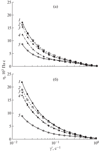 Кривые течения жидких кристаллов, содержащих наночастицы CuO со средним диаметром 92 ± 3 нм. Концентрация CuO, мас. %: 1 – 0.3, 2 – 0.1, 3 – 0.03, 4 – 0.01, 5 – 0.0. Т = 25 (а), 37°С (б).