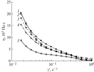 Кривые течения жидких кристаллов, содержащих субмикронные частицы CuO (средний диаметр 151 ± 9 нм, средняя длина 268 ± 36 нм). Концентрация CuO, мас. %: 1 – 0.3, 2 – 0.1, 3 – 0.03, 4 – 0.01, 5 – 0.0. Т = 25°С.