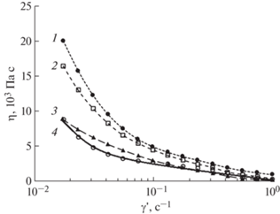 Кривые течения жидких кристаллов, содержащих частицы CuO различного размера и формы: 1 – диаметр 151 ± 9 нм и длина 268 ± 36 нм, цилиндрические; 2 – диаметр 92 ± 3 нм, сферические; 3 – диаметр 31.2 ± 3.6 мкм, сферические; 4 – контрольный образец. Концентрация CuO 0.1 мас. %, Т = 25°С.