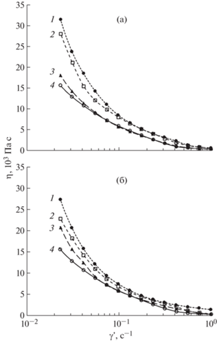 Кривые течения жидких кристаллов, содержащих наночастицы Al2O3 сферической формы с диаметром 84 ± 32 нм (а), ZnO игольчатой формы диаметром 37 ± 6 нм и длиной 302 ± 77 нм (б). Концентрация оксидов, мас. %: 1 – 0.3, 2 – 0.1, 3 – 0.01, 4 – 0.0. Т = 25°С.