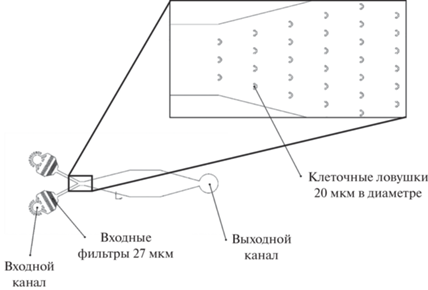 Общая схема микрофлюидного чипа с клеточными ловушками показана на рис. 1. Чип имеет два входных и один выходной канал. Каждый из входных каналов оснащен системой фильтрации. В центральной камере чипа располагаются клеточные ловушки диаметром 20 мкм для фиксации клеток.