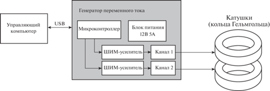 Разработка лабораторной установки для управления магнитными нанодисками. Лабораторная научно-исследовательская установка для поиска оптимальных режимов адресной деструкции клеток-мишеней в низкочастотных магнитных полях, осуществляемого на экспериментальных клеточных моделях глиальных опухолей, была разработана специально для этого эксперимента (рис. 2). Катушка состоит из колец Гельмгольца со средним диаметром 6 см и подключена к генератору переменного тока с системой управления. Катушка может генерировать МП с максимальной индукцией 150 Э. Установка позволяет изменять форму переменного МП (прямоугольная или синусовая), частоту, напряженность и скважность переменного МП прямоугольной формы. В катушках может создаваться МП с максимальной индукцией 200 Э. Катушки подключены к генератору переменного тока. Каждая катушка подключена к отдельному каналу генератора. Раздельные каналы генератора позволяют формировать как однородное, так и неоднородное МП. Генератор выполнен на микроконтроллере AtMega328P и подключается к компьютеру через USB-контроллер c функцией виртуального COM-порта. (CP210x usb to uart bridge). Генератор имеет встроенный блок питания 12 В 5 А от сети переменного тока 220 В и вентилятор для охлаждения. Создание соответствующей формы и амплитуды тока обеспечивается широтно-импульсной модуляцией. Генератор позволяет выдавать сигналы синусоидальной и прямоугольной формы. Для сигнала задаются следующие параметры: freq – частота от 0.1 до 1000 Гц, amp – амплитуда от 0.1 до 100, dFi – разность фаз двух катушек в градусах, 0 – фазы совпадают, 180 – сигналы находятся в противофазе.