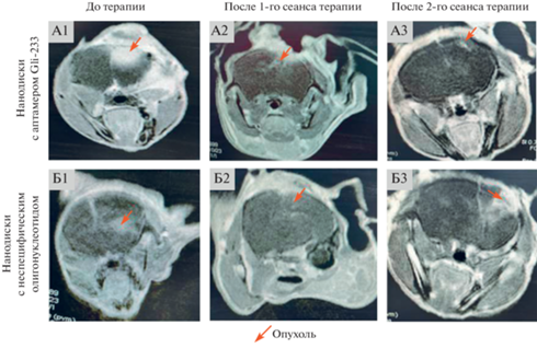 Развитие и лечение глиальных опухолей у мышей контролировали с помощью визуализации методом ЯМР-томографии. Исследования показали, что в течение 14 дней опухоль увеличилась до значительных размеров (рис. 4). Глиальная опухоль после четырех сеансов магнитомеханической терапии с использованием “умного” наноскальпеля в переменном МП (10 Гц, 150 Э) постепенно уменьшалась (рис. 4, А1–A3), в то время как глиальные опухоли у мышей, которых лечили нанодисками, модифицированными неспецифическими аптамерами, продолжали увеличиваться в размерах (рис. 4, Б1–Б3).