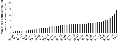 Скрининг штаммов дрожжей, выделенных из природных условий. Выделено 49 штаммов дрожжей из спонтанно сброженного виноградного сусла различных сортов винограда, произрастающего в трех виноградарских регионах Крымского полуострова: 14 из Ялтинского (Yа-1–Yа-14), 27 из Севастопольского (Se-15–Se-42), 6 из Судакского (Su-43–Su-49). Анализ массовой концентрации остаточных сахаров в винах, полученных с использованием этих штаммов, показал, что у 67% полученных вин (33 образца) концентрации несброженных остаточных сахаров превышали нормируемые значения 4.0 г/дм3, поэтому эти штаммы не могут быть использованы для производства сухих вин (рис. 1). Штаммы, обеспечившие сбраживание остаточных сахаров до нормируемых значений сухих вин, обозначены следующими номерами: Yа-4, Yа-5, Yа-7, Yа-8, Yа-9, Yа-10, Yа-12, Yа-14, Se-15, Se-17, Se-23, Se-25, Se-28, Se-39, Se-42, Su-44, Su-48.