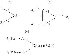 На рис. 1б) показан граф распределенной системы с тремя вычислительными узлами h1, h2, h3 и отображенными на них процессами P1, P2, P3 соответственно. Распределенная система включает также три коммутатора: A и B – второго типа, C – первого типа. Сплошными линиями показаны пары разнонаправленных соединений между узлами, а цифры показывают пропускные способности соединений. На рис. 1в) показано решение первой ЦЛП-задачи: маршруты, соответствующие потокам данных P1 → P3 (пунктирные линии) и P2 → P3 (штриховые линии).