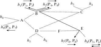 Первая ЦЛП-задача при назначении процессов P0, …, P9 на узлы h0, …, h9 соответственно решения не имеет. В данном случае причину установить не сложно: пропускная способность соединений, связывающих коммутатор C с другими коммутаторами, недостаточна для трех входных потоков процессов P3, P4. Задача будет иметь решение, если добавить в систему (рис. 3б) одно из соединений (C, E) или (C, F).
