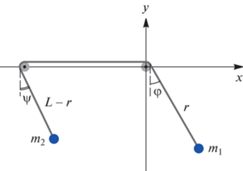 $\begin{gathered} \mathcal{L} = \frac{{{{m}_{1}}}}{2}({{{\dot {r}}}^{2}} + {{r}^{2}}{{{\dot {\varphi }}}^{2}}) + \frac{{{{m}_{2}}}}{2}({{{\dot {r}}}^{2}} + {{(L - r)}^{2}}{{{\dot {\psi }}}^{2}}) + \\ \, + {{m}_{1}}gr\cos \varphi + {{m}_{2}}g(L - r)\cos \psi , \\ \end{gathered} $Используя функцию Лагранжа (2.1), запишем уравнения движения в виде (см., напр., [18])