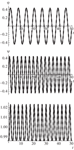 Используя найденные решения (3.33)–(3.35), можно вычислить начальные значения функций $\varphi (0)$, $\psi (0)$, $r(0)$ и их производных $\dot {\varphi }(0)$, $\dot {\psi }(0)$, $\dot {r}(0)$ при выбранно значении параметра $\varepsilon $, а затем найти соответствующие численные решения уравнений движения (2.7)–(2.9) с помощью встроенной функции $NDSolve$. Визуализация найденных аналитических решений при $\varepsilon = 0.2$ (сплошные тонкие линии на рис. 2) демонстрирует хорошее совпадение с численными решениями (штриховые линии на рис. 2).