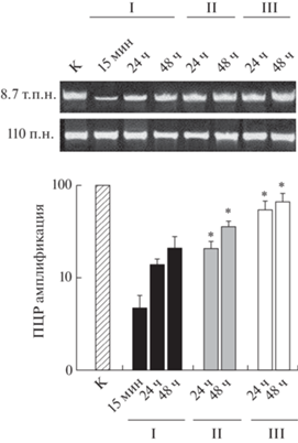 Анализ повреждений и репарации ядерной ДНК в ткани селезенки мышей через 15 мин, 24 и 48 ч после рентгеновского облучения в дозе 5 Гр. Амплифицировали длинные фрагменты яДНК (8.7 т.п.о.). Эти данные были нормализованы к коротким фрагментам яДНК (110 п.о.), полученным с использованием того же образца ДНК. I – 5 Гр, II – МЕЛ + 5 Гр (за 30 мин до облучения), III – 5 Гр + МЕЛ (20 мин после облучения). К – контроль (необлученные мыши). Данные представлены как среднее ± SEM из 5–6 независимых экспериментов.