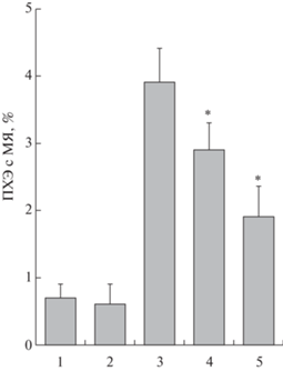 Частота образования микроядер в полихроматических эритроцитах костного мозга мышей после рентгеновского облучения в дозе 2 Гр. 1 – контроль (необлученная группа); 2 – после введения МЕЛ; 3 – облученные; 4 – МЕЛ (за 30 мин до облучения) + облучение; 5 – облучение + МЕЛ (20 мин после облучения). Анализы проводили через 24 ч после облучения. Данные представлены как среднее значение ± SEM из 5–6 независимых экспериментов. * Статистически значимые различия p < 0.05.