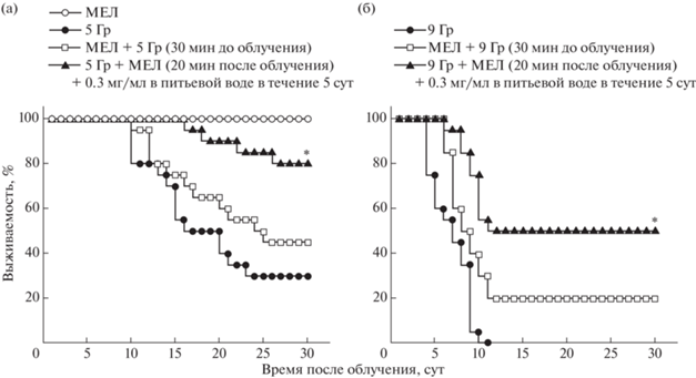 Кривые выживаемости мышей (n = 30) при введении МЕЛ (125 мг/кг) за 30 мин до и через 20 мин после рентгеновского облучения (с дополнительным введением МЕЛ 0.3 мг/мл в питьевой воде в течение 5 дней) в дозах 5 Гр (а) и 9 Гр (б). Выживание животных наблюдали в течение 30 дней после облучения. * Статистически значимые различия p < 0.05.