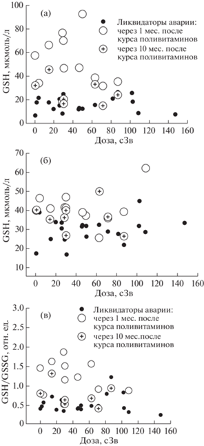 При применении поливитаминного комплекса, по-видимому, ответ системы глутатиона в плазме крови у ликвидаторов аварии при облучении в низких дозах выражен сильнее, чем при высоких дозах. Так, в диапазоне дозовых нагрузок от 2 до 50 сЗв через 1 мес. после приема препарата обнаружено явное увеличение содержания GSH, GSSG и ТДО в плазме крови в (рис. 2, а–в). С повышением дозы радиационного воздействия (свыше 50 и до 150 сЗв) содержание GSH в плазме крови и ТДО у ликвидаторов аварии снижается как в ранние, так поздние сроки после курса поливитаминов (рис. 2, а, в). Уровень GSSG в плазме крови у ликвидаторов сохраняется на высоком уровне во всем интервале дозовых нагрузок (0.2–150 сЗв) и через 1 и 10 мес. после приема поливитаминов (рис. 2, б).