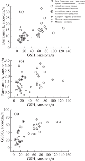 Наиболее сложная зависимость наблюдается между GSH и витамином А в плазме крови у облученных детей через 1 мес. после витаминотерапии. Трехкратному увеличению содержания GSH (диапазон от 40 до 120 мкмоль/л) соответствуют два разных уровня витамина А, а именно: низкое его содержание (диапазон от 0.5 до 1.5 мкмоль) и высокая концентрация в плазме крови (диапазон от 2.0 до 3.2 мкмоль/л) (рис. 3, б). Через 10 мес. после приема поливитаминного комплекса содержание GSH и витамина Е в плазме крови у детей снижается до контрольных значений (рис. 3, а). Однако повышенные уровни витамина А и GSSG в плазме крови у детей все еще сохраняются и в отдаленный период (рис. 3, б, в).