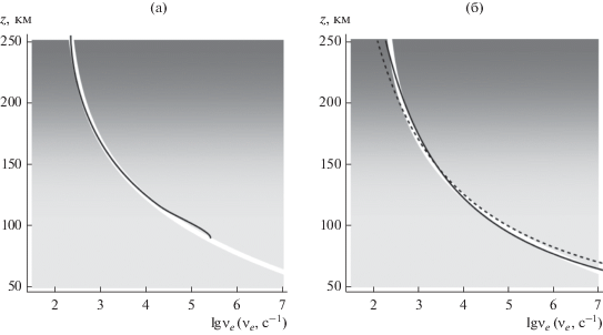 Модель зависимости эффективной частоты соударений электронов νe. от высоты z, взятая из экспериментальных данных, показана на рис. 2а и 2б широкой белой линией [13]. Как и на рис. 1, плотность электронной концентрации показана фоном.