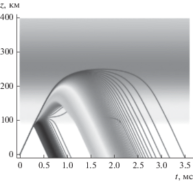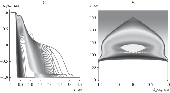 Зависимости вертикальной компоненты волнового вектора ${{k}_{z}}$ от времени t и высоты z показаны на рис. 4. Частота возрастает от 1 до 6.993 МГц на рис. 4а слева направо, а на рис. 4б – снизу вверх.