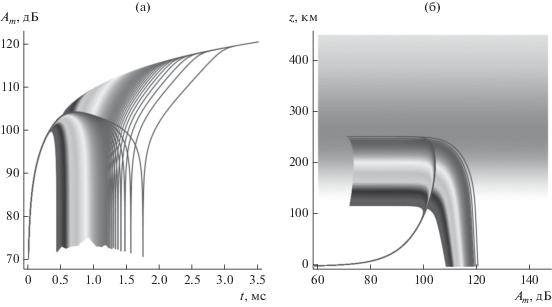 Рассмотрим теперь амплитудные характеристики, получаемые из решения расширенной бихарактеристической системы (18). Зависимости ослабления сигнала ${{A}_{m}}$ от времени и высоты