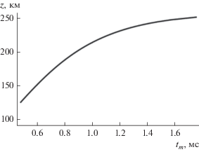 Использую частоту f как параметр и опираясь на данные рис. 6а и 6б, можно построить зависимость высоты отражения сигнала ${{z}_{m}}$ от задержки ${{t}_{m}}$ (рис. 7). Для однослоевой модели эта кривая плавная и взаимно-однозначная.