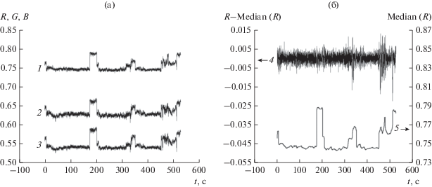 $\begin{gathered} {{\left[ {R\left( n \right)G\left( n \right)B\left( n \right)} \right]}^{T}} = \\ = \frac{1}{{{\text{ROI}}}}\sum\limits_{i,\,j \in {\text{ROI}}} {{{{\left[ {{{r}_{{i,j}}}\left( n \right){{g}_{{i,j}}}\left( n \right){{b}_{{i,j}}}\left( n \right)} \right]}}^{T}}} . \\ \end{gathered} $Эффективное по критерию вычислительных затрат удаление выбросов и артефактов RGB-сигналов (рис. 1а), измеренных в МТЦ МГТУ, реализует, по нашему мнению, процедура медианной фильтрации median{R(n)}, для R-сигнала (рис. 1б, кривая 5). Апертура фильтра N согласована с интервалом временнóй дискретизации ВР (1) Δt = 1/30 с и нижней границей fмин = 0.15 Гц частотного диапазона дыхательной волны [1, с. 16] в соответствии с формулой
