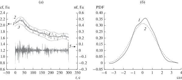 Статистики мгновенных частот основного тона сердечных сокращений: реализации структурных компонент мгновенных частот (а): кривая 1 – тренд, кривые 2 и 3 – границы полосы Болинджера, кривая 4 – сумма тренда и квазициклической составляющей, кривая 5 – шумовая компонента; плотность распределения вероятностей центрированных и нормированных мгновенных частот (б): кривая 1 – гистограмма сглаженная сдвигом, кривая 2 – гауссовское приближение гистограммы.
