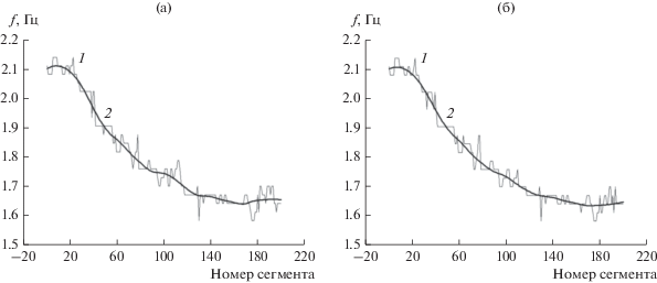 Зависимость частоты основного тона сердечных сокращений от номера сегмента пульсовой волны согласно алгоритму POS (а) и модели Cr (б): кривая 1 – абсолютные максимумы периодограмм, кривая 2 – сглаженные оценки.