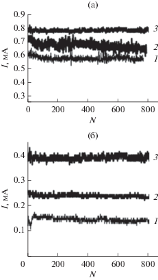 Зависимости амплитуд автоэмиссионных токов от количества импульсов анодных напряжений различной длительности – 10 (1), 30 (2) и 50 мкс (3) – для кристаллов кремния n- (а) и р-типа (б) при плазменной обработке в среде CF4.