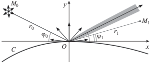 Везде далее предполагается, что точка источника ${{M}_{0}} = \left( {{{x}_{0}},{{y}_{0}}} \right)$ и точка наблюдения ${{M}_{1}} = \left( {{{x}_{1}},{{y}_{1}}} \right)$ лежат на больших по сравнению с длиной волны расстояниях от точки негладкости $O$: