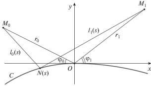 Обозначим расстояние от произвольной точки контура $N\left( s \right) = \left( {X\left( s \right),Y\left( s \right)} \right)$ до точки источника ${{M}_{0}} = \left( {{{x}_{0}},{{y}_{0}}} \right)$ через ${{l}_{0}}\left( s \right)$, а до точки наблюдения ${{M}_{1}} = \left( {{{x}_{1}},{{y}_{1}}} \right)$ через ${{l}_{1}}\left( s \right)$ (рис. 2):