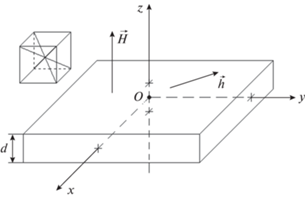 Геометрия задачи, соответствующая схеме рабочего элемента магнитострикционного преобразователя, совпадающая с принятой в работе [10], показана на рис. 1. В основе задачи лежит плоскопараллельная пластина толщиной $d$, обладающая магнитными, упругими и магнитоупругими свойствами. Материал пластины имеет кубическую кристаллографическую симметрию, плоскость (100) которой совпадает с плоскостью пластины. Внешнее постоянное магнитное поле ${{\vec {H}}_{0}}$ приложено перпендикулярно плоскости пластины, в плоскости пластины действует переменное магнитное поле $\vec {h}$. Задача решается в декартовой системе координат $Oxyz$, плоскость Oxy которой совпадает с плоскостью пластины, а оси Ox, Oy и Oz параллельны ребрам куба кристаллографической ячейки. Центр системы координат O находится в центре пластины, так что ее плоскости соответствуют координатам $z\,\, = \,\, \pm {d \mathord{\left/ {\vphantom {d 2}} \right. \kern-0em} 2}$.