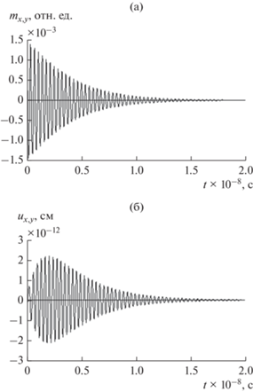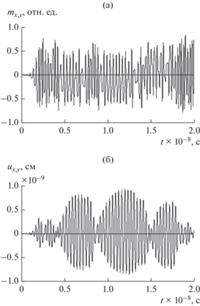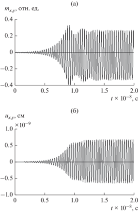 Упругая система здесь играет роль нагрузки, налагаемой на магнитную, т.е. упругие колебания развиваются под действием возбуждения, создаваемого магнитной системой. При этом, как видно из сравнения рис. 2б с рис. 2а, пока амплитуда магнитных колебаний довольно велика, т.е. до времени около $0.2 \times {{10}^{{\, - 8}}}$ с, амплитуда упругих колебаний растет, а далее амплитуда упругих колебаний падает, поскольку магнитные колебания ослабевают.